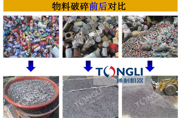 小型易拉罐粉碎機可處理物料包括:易拉罐,露露罐,紅牛罐,鐵罐,鋁罐,啤酒罐,花盒,油漆桶,轉子,定子,鐵屑,輕薄料等廢金屬,型的易拉罐破碎機也可以處理廢鋼,廢鐵,彩鋼瓦,鐵皮,汽車殼,發動機,輪轂,廢舊家電等物料,用戶只需告訴我們您廠區的待處理料即可,我們便能快速的為您提供出生產方案,為您搭配合適的生產線,并為您提供產品的報價。